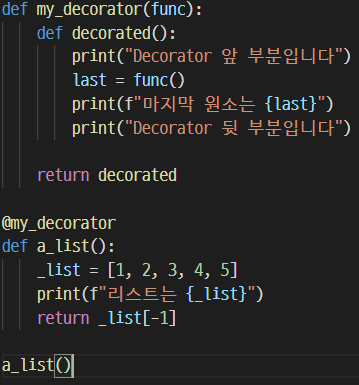 - decorator 역할을 하는 함수를 정의, 이 함수의 인자에 decorator를 적용받을 함수를 받는다.