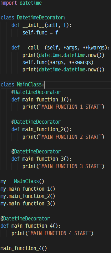 만약, 클래스로 정의하려면 __call__에 정의하여 사용하면 된다. 다음은 예시다. decorator는 예시와 같이 주로 로그를 남기는데 사용하거나, 웹페이지라면 사용자를 로그인 페이지로 리다이렉트(redirect)할 때 주로 사용된다고 한다. 그리고 보통은 클래스 형태보다는 함수 형태의 decorator를 더 많이 사용한다고 한다.