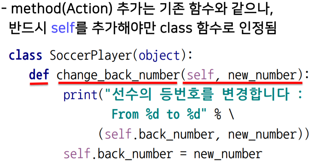 class의 함수에는 첫번째 인자로 self를 매개변수로 받아야한다.