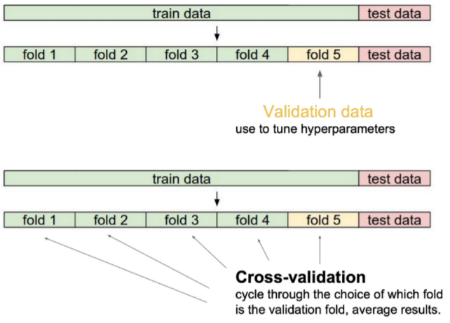 Cross-Validation : 이름 그대로 교차하면서 Validation data를 사용하는 것이다. Validation data를 Training data 중에서 일부분을 골라서 사용하고, 다음 EPOCH때는 다른 일부분을 골라서 Validation data로 사용하는 방식이다. 중요한 것은, 절대로 Test data를 사용하면 안된다.