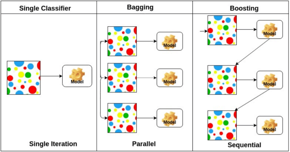 Bagging(Bootstrapping aggregating) : Ensemble Learning이라고도 한다. Bootstrapping은 통계학 및 ML에서 랜덤 샘플링(중복 허용)을 통해 데이터를 뽑아내는 것이다. 이렇게 Bootstrapping을 이용하면 데이터가 충분치 않아도 ensemble을 만들 수 있다. 방법은 간단하다. Bootstrapping을 통해 데이터를 랜덤으로 추출하고, 그 데이터로 모델을 훈련시킨다. 여기서 Bootstrapping을 여러번 해서 여러 데이터셋을 만든다. 이걸로 같은 알고리즘으로 모델을 여러 개 만든다. 물론 데이터셋이 다르므로 구조는 같아도 서로 다른 모델이다. 이 모델들의 각각의 출력값을 Voting(다수결 투표)하여, 가장 많이 정답이라고 나온 예측을 정답으로 사용한다. 간단하면서도 꽤 강력한 방법이다.