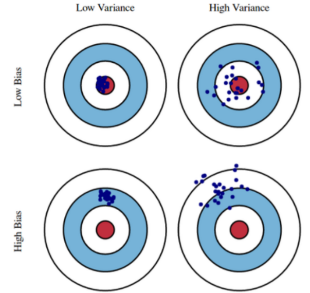 Bias and Variance : 쉽게 말하자면 variance는 분포에 대한 분산을 의미하는데, model에 대한 variance가 작으면 비슷한 입력값에 대해서 비슷한 출력을 내게 된다. 그러나 variance가 크다면, 입력값이 살짝만 틀어져도 꽤 다른 출력이 나오게 된다. bias는 전체적인 분포에 대한 편향이다. 이는 모든 데이터에 대해 똑같은 방향으로 똑같은 크기만큼 shift된 것으로 생각할 수 있다. 아래의 그림을 참조하자.