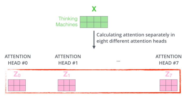 일반적인 attention은 이러하지만, Multi-headed Attention이라는 것이 있다. 위와 달리 head가 여러 개 있다는 것으로, Q, K, V 벡터가 head 개수만큼 존재한다.