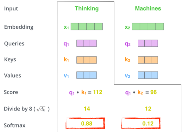 그렇게 벡터들을 얻어내면, Q벡터와 K벡터를 위 그림과 같이 내적하여 각 단어에 대한 Score를 계산한다. 중요한 건, 현재 단어에 대한 Score를 얻을 때, 그 단어의 Q벡터를 사용하고 K벡터는 문장 내의 모든 단어들에 대한 K벡터를 각각 내적하는 것이다.