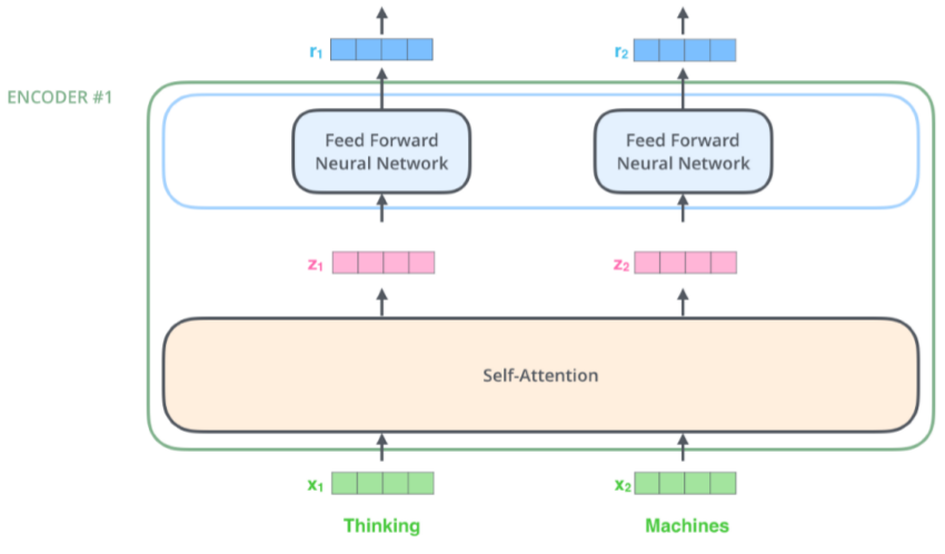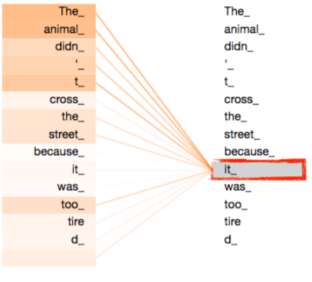 이 word vector들이 Encoder 내의 Self-Attention layer를 거친 후에, Feed Forward Neural Network(Dense layer, 즉 일반적인 신경망 부분)를 거치게 된다. 이렇게 RNN과는 다르게 모든 단어들에 대해 한번에 Encoding을 하고 feature를 얻게 되므로, 문장의 문맥에 따라 각 단어들이 문장에서 가지는 관계를 학습할 수 있게 된다. 아래의 그림은 문장 "The animal didn't cross the street because it was too tired"에서 it이 어떤 단어와 관련이 있는지를 학습하여 보여주는 그림이다. (The animal과 관련이 깊다고 나온다.)