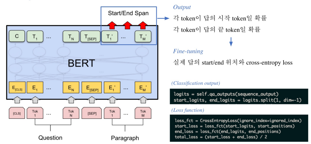 모델의 output으로 각 token이 시작일 확률 및 끝일 확률을 뽑아내어서 cross-entropy loss를 통해 훈련한다.