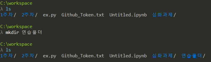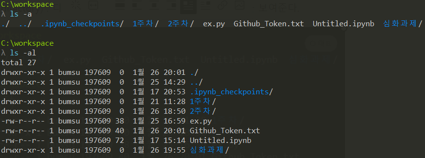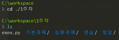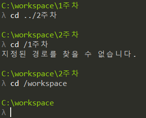 여기서 알수 있는 것 : cd를 그냥 쓰면 pwd랑 다를 게 없다. cd 다음에 바로 경로가 오면 현재 디렉토리 기준으로 접근하는 것이다. 즉, 앞에 ./이 붙는 것과 다를게 없다. 반면에 cd ..는 부모 디렉토리로 이동하는 것이다. cd ../2주차 이런식으로도 이동이 가능하다. 마지막으로, cd / 는 root 디렉토리로 이동하게 된다. (여기서는 C:\으로 이동하는 것이다.) cd /workspace 이런식으로도 이동이 가능하다.