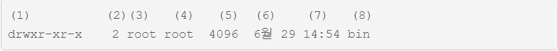 그 외에 (2)는 하드링크 번호로 링크된 파일의 수를 의미하고, (3)은 소유자, (4)는 소유 그룹이다. (5)는 파일 크기(byte 단위), (6), (7)은 수정 시간이다. (8)은 파일 또는 디렉토리의 이름을 의미한다.