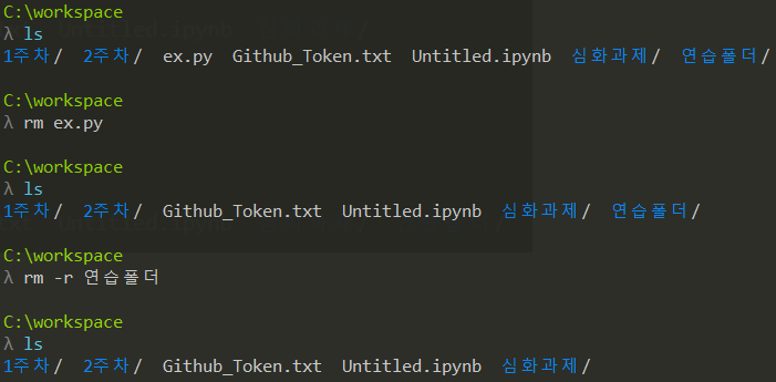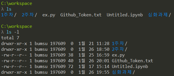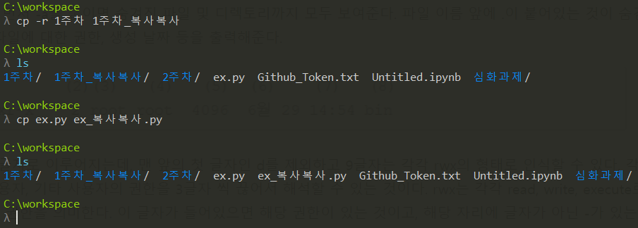 여기서 알수 있는 것 : cd를 그냥 쓰면 pwd랑 다를 게 없다. cd 다음에 바로 경로가 오면 현재 디렉토리 기준으로 접근하는 것이다. 즉, 앞에 ./이 붙는 것과 다를게 없다. 반면에 cd ..는 부모 디렉토리로 이동하는 것이다. cd ../2주차 이런식으로도 이동이 가능하다. 마지막으로, cd / 는 root 디렉토리로 이동하게 된다. (여기서는 C:\으로 이동하는 것이다.) cd /workspace 이런식으로도 이동이 가능하다.