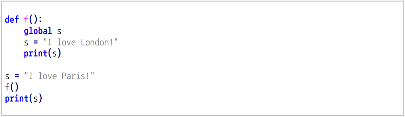 변수의 범위(Scoping Rule) : 전역 변수는 함수 내에서 사용 가능하지만, 함수 내에서 같은 이름으로 변수 선언 시, 지역 변수로 접근하게 됨. 만약, 전역 변수를 사용하고 싶다면, global 키워드를 사용해야 함.