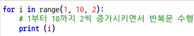 반복문 for문의 range : range(시작값, 종료값, 증강값)으로 이루어진다. 값이 1개만 들어오면 종료값인 것이며, 2개가 들어오면 시작값 및 종료값, 3개가 다 들어오면 시작값, 종료값, 증강값이다. 종료값은 자기 자신은 포함되지 않는다.