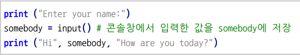 Console I/O : Python에서는 주로 input()함수를 통하여 입력을 받을 수 있다. 여기서, input()을 통해 입력받은 값은 str 형태이므로, int나 float으로 바꾸려면 int() 및 float() 등을 씌워주면 된다.