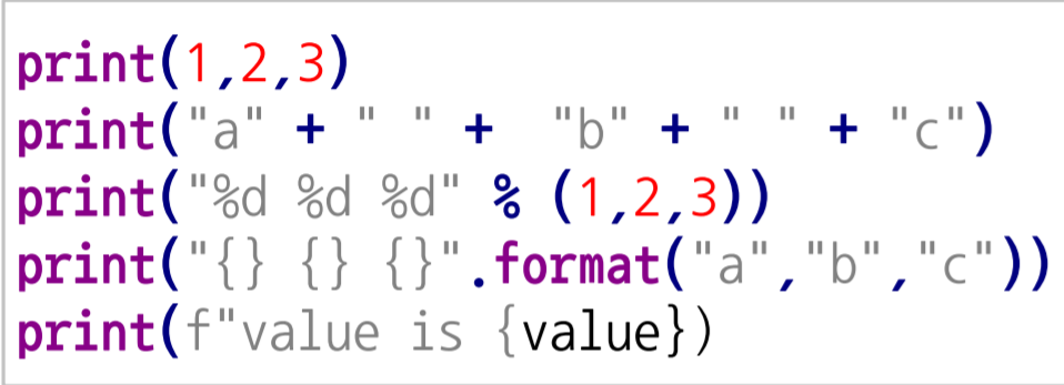 Print formatting : print()문의 양식을 지정할 수 있는데, %를 이용하는 것과, format을 이용하는 것, 그리고 fstring을 이용하는 것이 있다. (fstring에 익숙해져야 한다.)