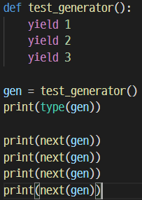 generator : 간단하게 말하자면 iterator를 만드는 function이다. generator의 가장 큰 특징은 yield라는 키워드를 사용한다는 것인데, 다음과 같다.
