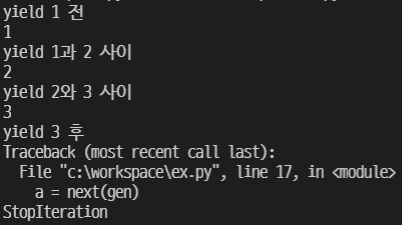 - 함수 정의부분에서, yield가 사용된 순간, 그 함수는 일반적인 함수가 아닌 generator로 간주한다.