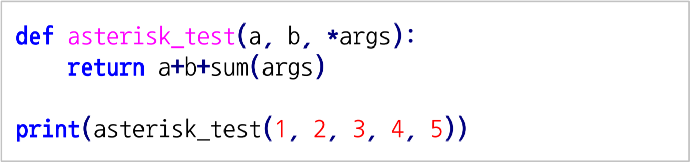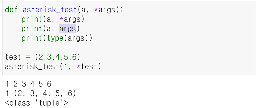 가변인자(Variable-length) : 개수가 정해지지 않은 변수를 함수의 parameter로 사용하는 것으로, *(asterisk)를 사용하여 나타낸다. 입력된 값은 tuple 형태로 사용하며, 가변인자는 오직 한 개만 맨 마지막 parameter 위치에 사용 가능하다.