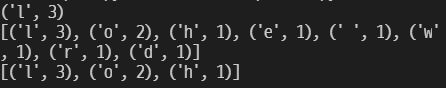Counter에 for문으로 접근 시 key값이 iterate된다. 그리고 Counter에 자체적으로 most_common() 메소드가 존재하며, parameter가 없으면 빈도의 내림차순으로 전체 다, parameter 값을 주면 그 숫자만큼 빈도 상위 몇 개를 뽑아온다.