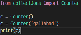 Counter : Sequence type의 data element의 개수들을 dict 형태로 반환해주는 자료구조. str, dict type, keyword parameter 들 모두 다 처리 가능하다.