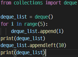append는 일반 List에서 처럼 deque의 오른쪽에 원소를 추가한다. appendleft는 deque의 왼쪽에 원소를 추가한다.