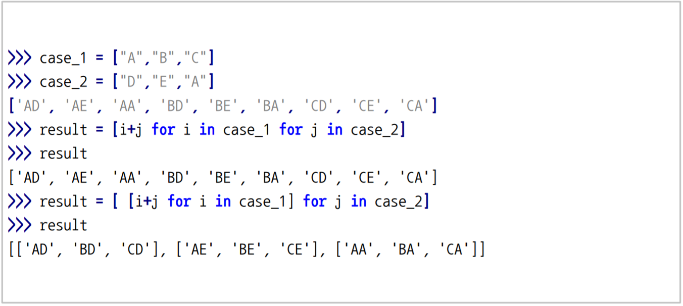 만약, [i + j for i in case_1] for j in case_2 이렇게 되면, one-dimensional과는 다르게 two-dimensional 리스트로 나오게 되며, for j in case_2가 바깥쪽 loop가 되고, for i in case_1이 안쪽 loop가 된다.