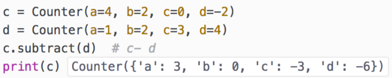 여기서, -와 subtract는 비슷하지만 차이가 있다. a - b 에서 a에는 원소가 없고 b에만 원소가 있다면, 그 원소는 연산에서 제외된다. 그러나, subtract를 사용 시 a.subtract(b)는 a에 뺄셈 결과가 적용이 되며, b에만 원소가 있으면 a에는 그 원소의 값이 0으로 사용된다. 따라서, b의 원소 개수의 마이너스로 나오게 된다.