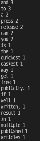 text를 소문자로 전부 바꾸고, 공백을 기준으로 토큰화하였다. word_count라는 defaultdict를 만들고, 기본값은 0으로 하였다. 이러면 각 단어별로 기본값은 처음에 0이며, 단어가 등장 시 1씩 값이 올라가므로 빈도수의 dictionary가 만들어진다. 이후에는, 이 dictionary를 빈도수의 내림차순으로 정렬한 이후에 출력하여 가장 많이 나온 단어 순으로 출력된다.