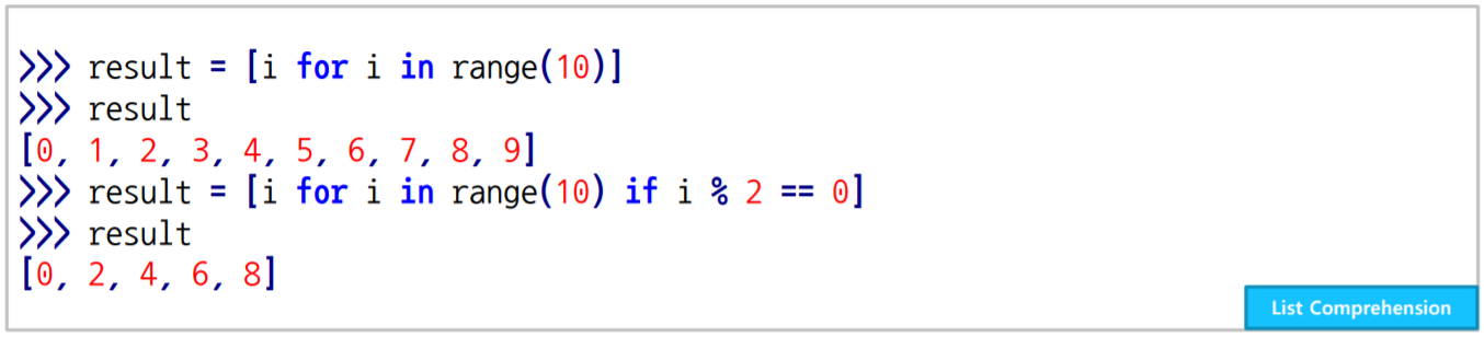 list comprehension : 기존 List를 사용하여 다른 List를 간단히 만드는 것으로, for + append보다 조금 더 빠르다. 정말 많이 쓰인다!