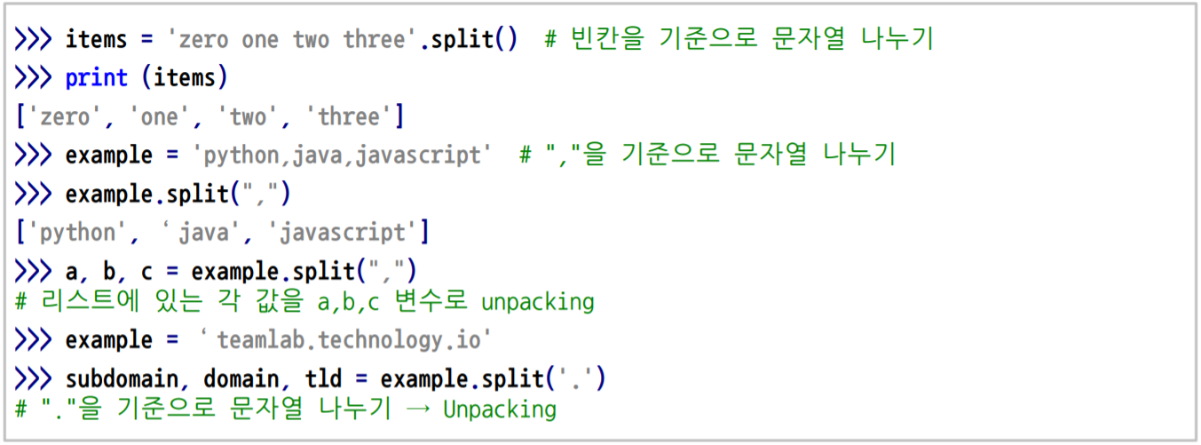 split & join : split은 string type의 값을 기준값으로 나눠서 리스트 형태로 나눈다! join은 반대로 리스트의 값들을 특정 string을 넣어서 합쳐준다.
