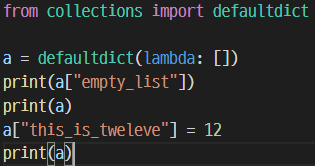 이런 식으로 사용할 수 있다. 존재하지 않던 key에 접근 시 그때부터는 기본값으로 defaultdict에 (key, value)로 들어가게 된다.