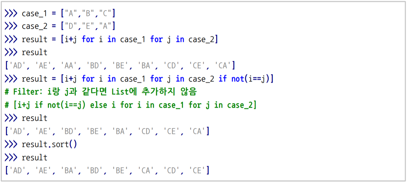 만약, [i + j for i in case_1] for j in case_2 이렇게 되면, one-dimensional과는 다르게 two-dimensional 리스트로 나오게 되며, for j in case_2가 바깥쪽 loop가 되고, for i in case_1이 안쪽 loop가 된다.