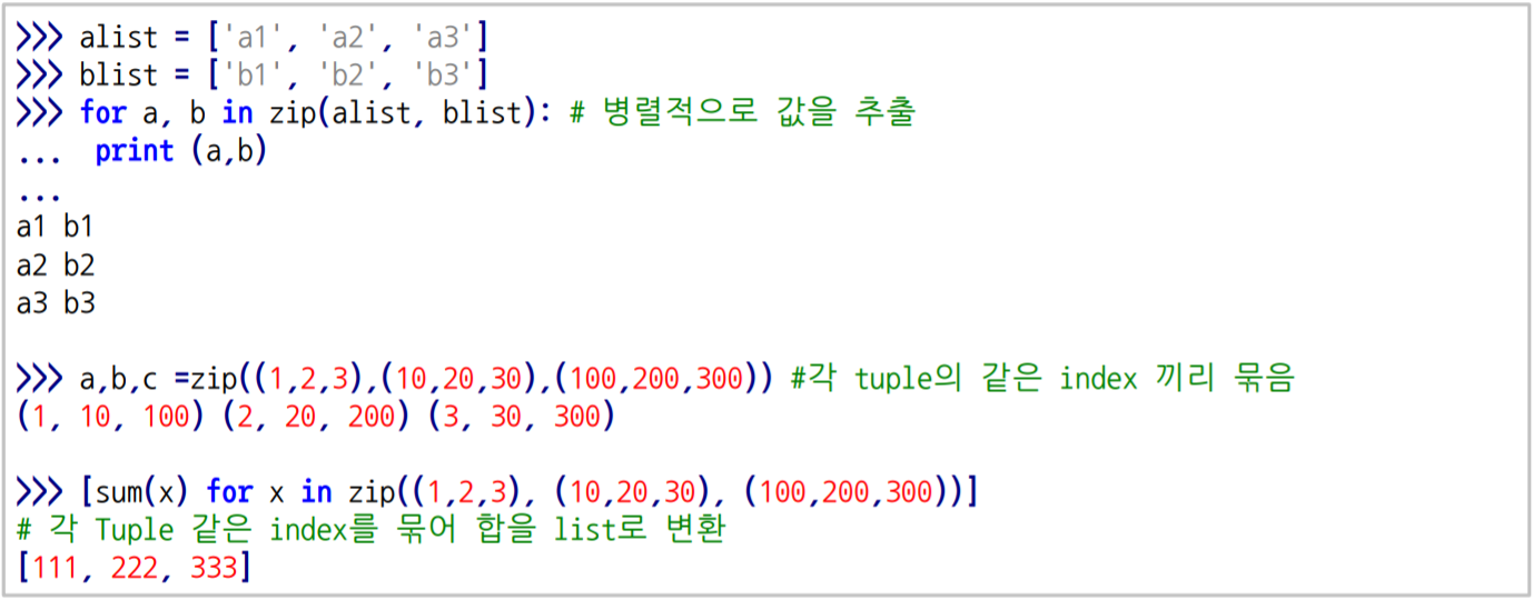 enumerate & zip : enumerate는 list의 element 추출 시 번호를 붙여서 같이 추출해준다. zip은 묶어주는 역할이다.