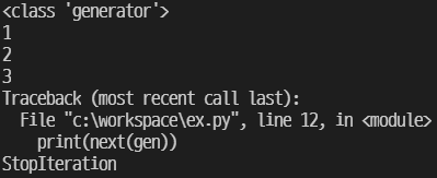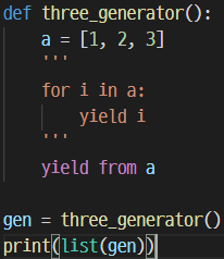 generator : 간단하게 말하자면 iterator를 만드는 function이다. generator의 가장 큰 특징은 yield라는 키워드를 사용한다는 것인데, 다음과 같다.