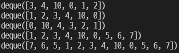 reversed는 deque 전체를 뒤집는 것으로 맨오른쪽부터 맨왼쪽까지 순서가 뒤바뀐다. extend는 deque의 오른쪽에 원소가 추가되며, extendleft는 왼쪽으로 추가되는데, 원소의 순서가 뒤집혀서 붙게 된다는 특징이 있다.