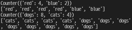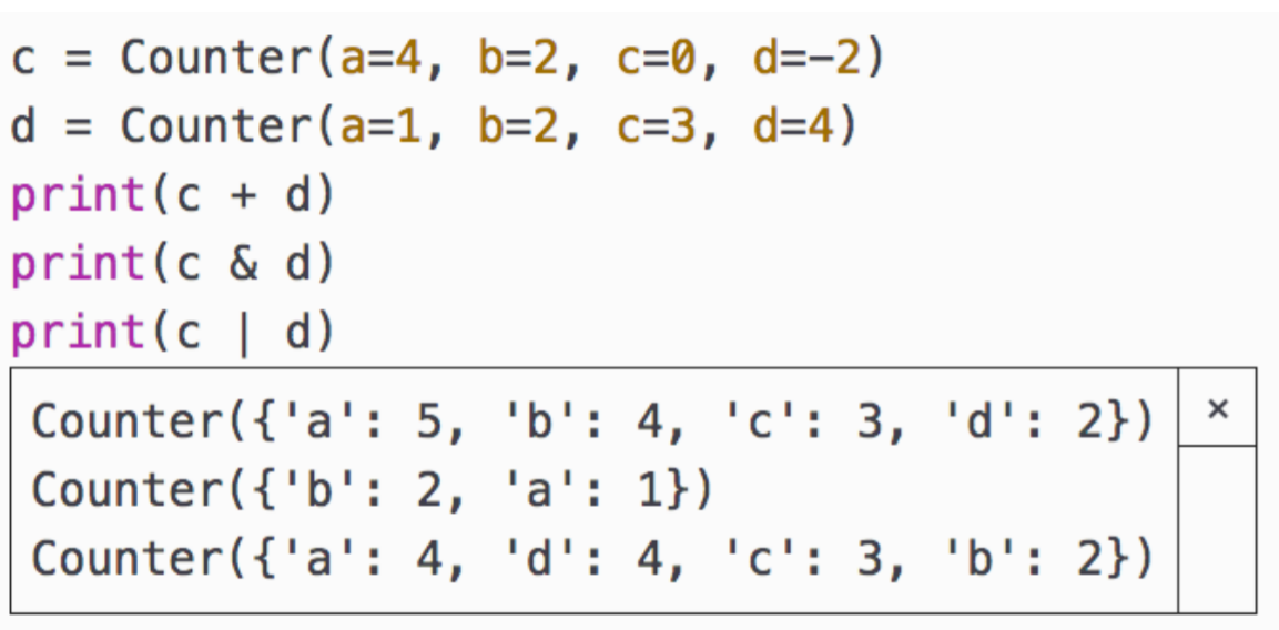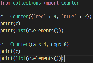 Counter : Sequence type의 data element의 개수들을 dict 형태로 반환해주는 자료구조. str, dict type, keyword parameter 들 모두 다 처리 가능하다.