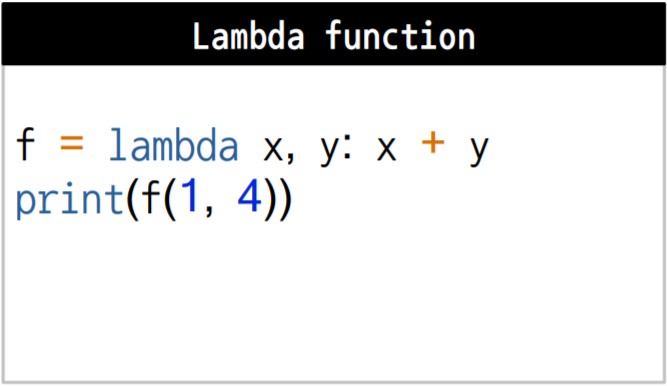 lambda : lambda는 익명 함수이다. 함수를 간단하게 정의할 수 있지만, Python 3부터는 권장하지 않는다. 그러나 여전히 많이 쓰인다. 문제점은 다음과 같다.
