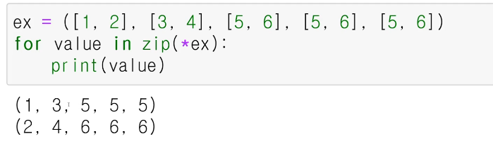 여기서 unpacking을 살펴보자. tuple, dict 등 자료형에 들어있는 값을 unpacking하는 것이며, 함수의 입력값이나 zip등에 유용히 사용 가능하다.