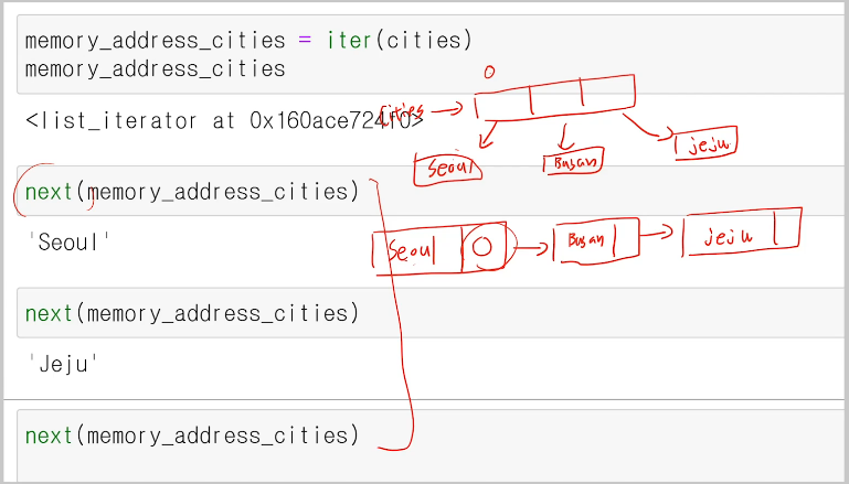 그림과 같이 iter()를 사용하여 iterator를 만들면, Linked List의 형태처럼 값과 다음 값의 주소값을 가진 형태로 데이터 구조를 생각할 수 있다. 이때, iterator 객체는 주소값을 가지고 있고, next()를 통해 순회하게 되면 현재값을 출력해주고, 주소값은 다음 값의 주소값으로 바뀌게 된다. 이를 통해 순회할 수 있게 된다. 중요한 것은 iterable하다고 해서 반드시 iterator라는 것은 아니다. iterator로 만들려면 built-in function인 iter()를 사용해야 한다. 또한, 순회 가능한 마지막 원소에 도달 시, 다음 next()를 실행하면 StopIteration exception이 발생하게 된다.