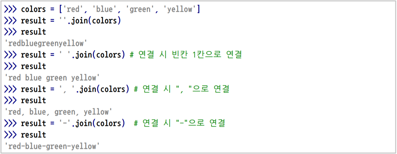 split & join : split은 string type의 값을 기준값으로 나눠서 리스트 형태로 나눈다! join은 반대로 리스트의 값들을 특정 string을 넣어서 합쳐준다.