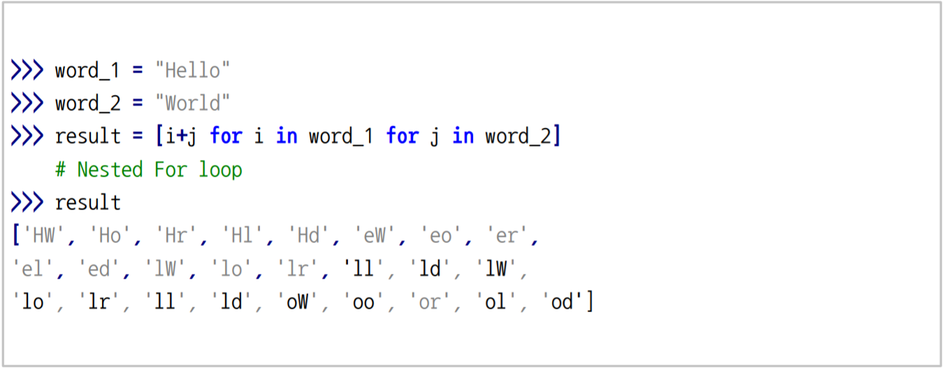 이렇게 for문이 2중 for문이라면, for i in word_1이 바깥 loop, for j in word_2는 안쪽 loop가 된다.