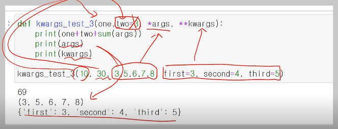 키워드 가변인자(Keyword variable-length) : parameter 이름을 따로 지정하지 않고 입력받는 방법으로, *(asterisk)를 2번 사용하여 나타낸다. 입력된 값은 dict type으로 처리되고, 가변인자는 오직 한 개만 기존 가변인자 다음에 사용 가능하다.