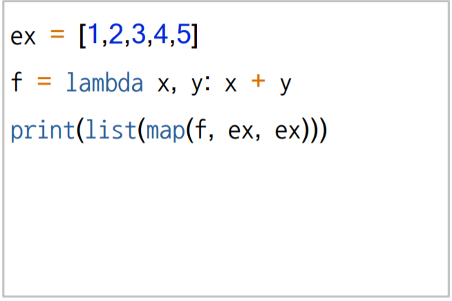 이렇게 매개변수가 2개 이상이면, map에 여러 개의 인자를 넣을 시, zip처럼 묶어줘서 잘 처리해준다. 결과는 [2, 4, 6, 8, 10]이 나온다.