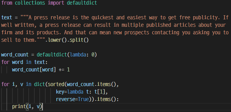 text를 소문자로 전부 바꾸고, 공백을 기준으로 토큰화하였다. word_count라는 defaultdict를 만들고, 기본값은 0으로 하였다. 이러면 각 단어별로 기본값은 처음에 0이며, 단어가 등장 시 1씩 값이 올라가므로 빈도수의 dictionary가 만들어진다. 이후에는, 이 dictionary를 빈도수의 내림차순으로 정렬한 이후에 출력하여 가장 많이 나온 단어 순으로 출력된다.