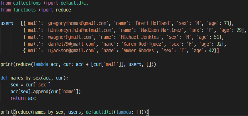 reduce : 주로 리스트에서의 누적 집계 시 사용되는 함수이다. 자세한 사용법은 다음과 같다.reduce(집계 함수, 순회 가능한 데이터[, 초기값])집계 함수는 2개의 인자를 받아야 한다. 앞의 인자는 누적자(Accumulator)으로, 함수 실행부터 끝까지 누적하는 값이며, 뒤의 인자는 현재값(Current Value)으로, 루프를 돌면서 계속해서 바뀌는 값이다.