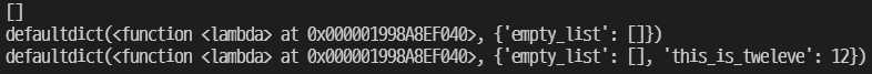 - defaultdict(lambda: "원하는 기본값") 이렇게 사용하는 것을 StackOverflow에서 추천하고 있다.