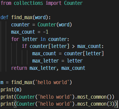 Counter에 for문으로 접근 시 key값이 iterate된다. 그리고 Counter에 자체적으로 most_common() 메소드가 존재하며, parameter가 없으면 빈도의 내림차순으로 전체 다, parameter 값을 주면 그 숫자만큼 빈도 상위 몇 개를 뽑아온다.