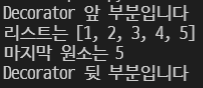 - decorator 역할을 하는 함수를 정의, 이 함수의 인자에 decorator를 적용받을 함수를 받는다.