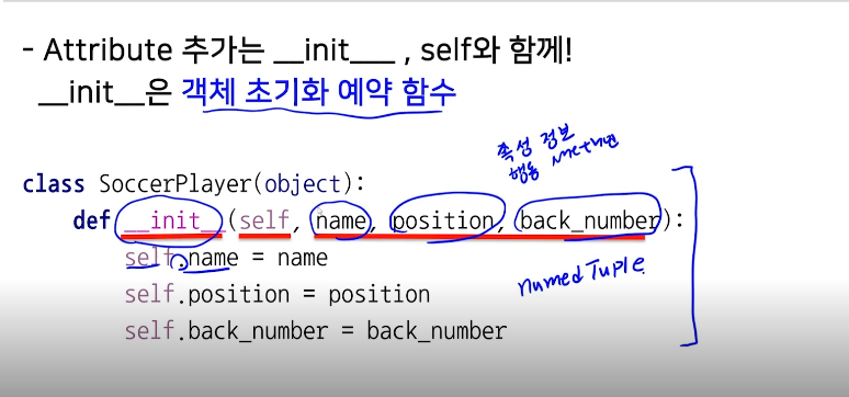 - __init__(self[, ...]) : __new__ 실행으로 인스턴스가 생성되면 다음으로 실행되는 메소드로, 주로 인자를 받고 내부 인스턴스 변수로 지정해주는 역할을 한다.