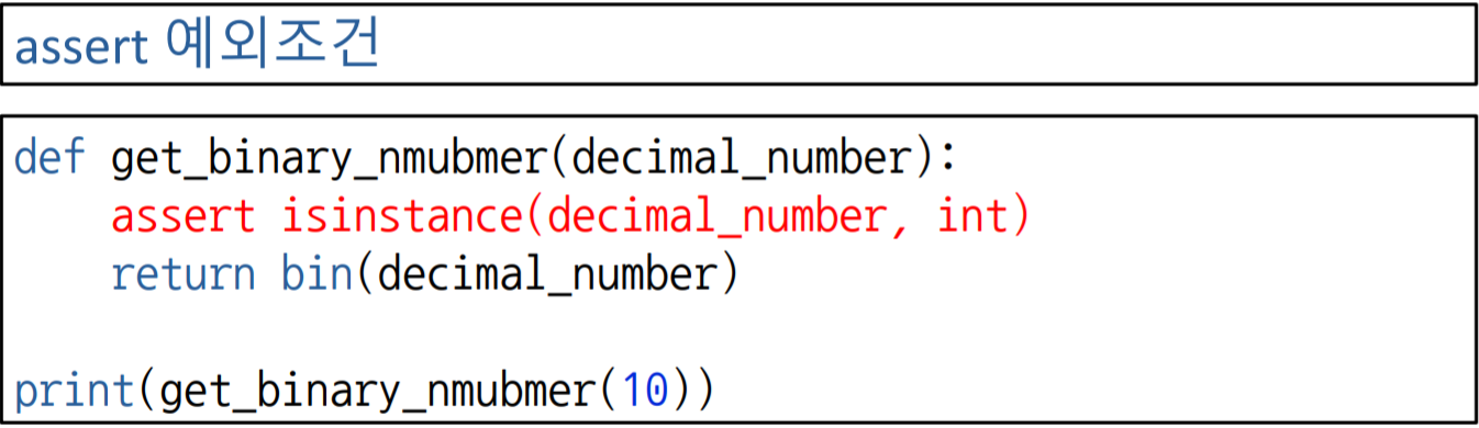 assert 문 : 조건을 만족하지 않을 시 예외를 발생시킴. 다음과 같이 사용함. 이렇게 미리 막는 이유는, 이 이후로 넘어가면 프로그램이 많이 꼬이거나 망가질 확률이 높아지므로, 미리 막아버리는 것임.