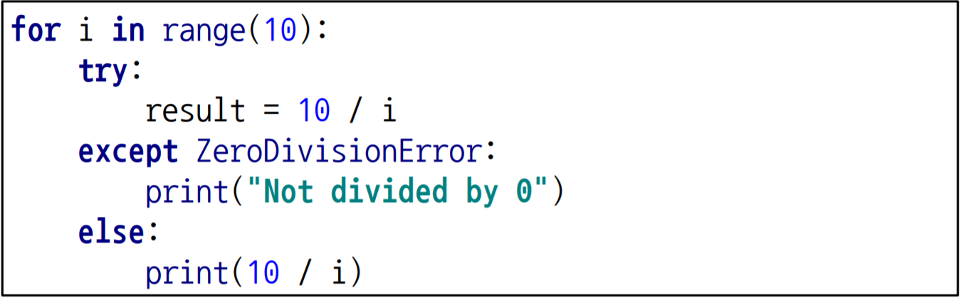 try ~ except else 문법 : else에는 예외가 발생하지 않을 때 동작할 코드를 작성해줌. 예시는 다음과 같음.
