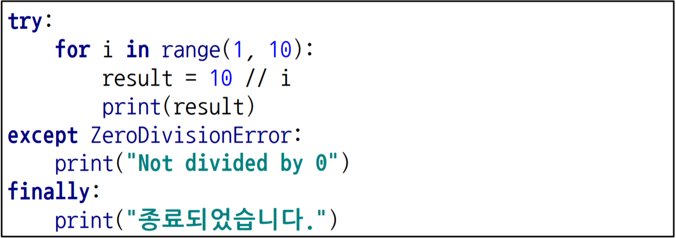 try ~ except finally 문법 : finally에는 예외가 발생하든 안하든 반드시 동작하는 코드를 작성해줌. 예시는 다음과 같음.